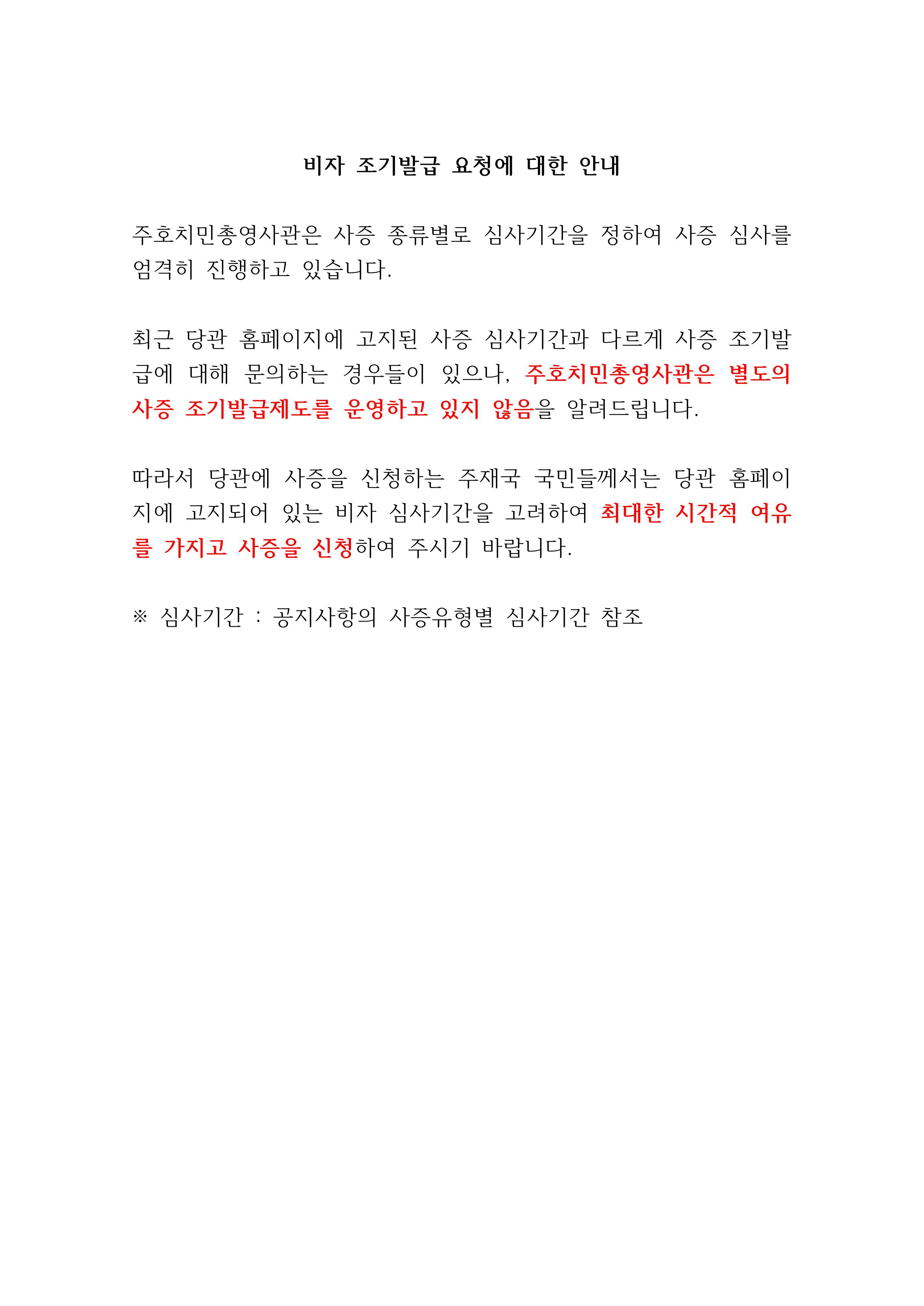 비자 조기발급 요청에 대한 안내